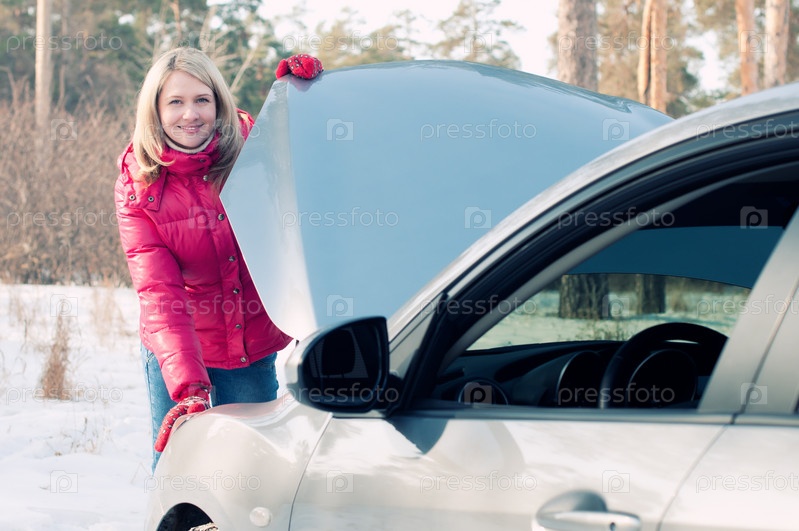 Улыбающиеся белокурая женщина стоит перед открытым капотом своего автомобиля