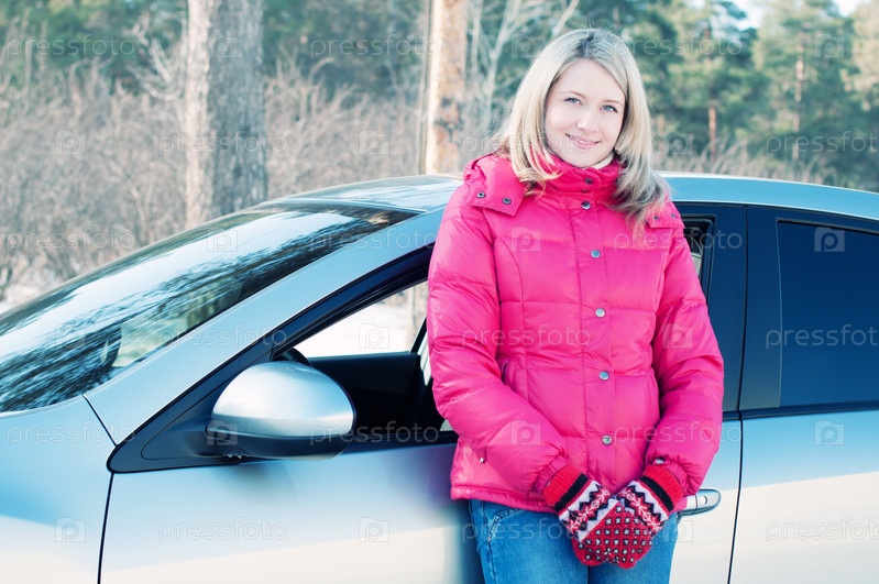 Счастливая светловолосая женщина стоит возле своей машины