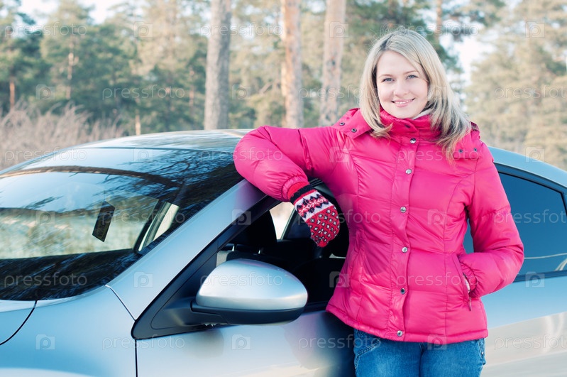 Молодая белокурая женщина стоит возле своей машины на зимней дороге