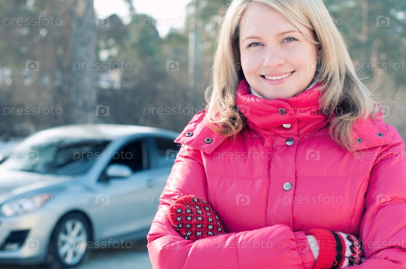 Молодая светловолосая женщина стоит на фоне своей машины, улыбается и смотрит в камеру