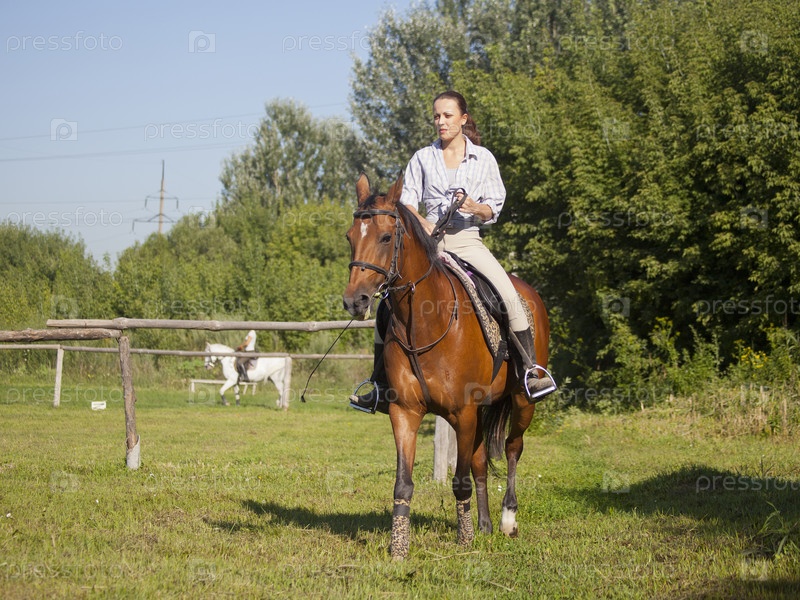 Девушка едет на лошади на тренировке в конно-спортивной школе