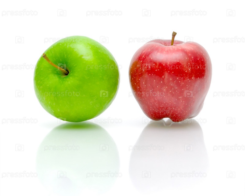 Зеленое и красное яблоки на белом фоне с отражением