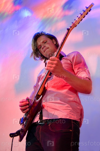 Гитарист играет соло на гитаре во время выступления