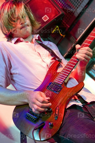 Гитарист играет соло на гитаре во время выступления