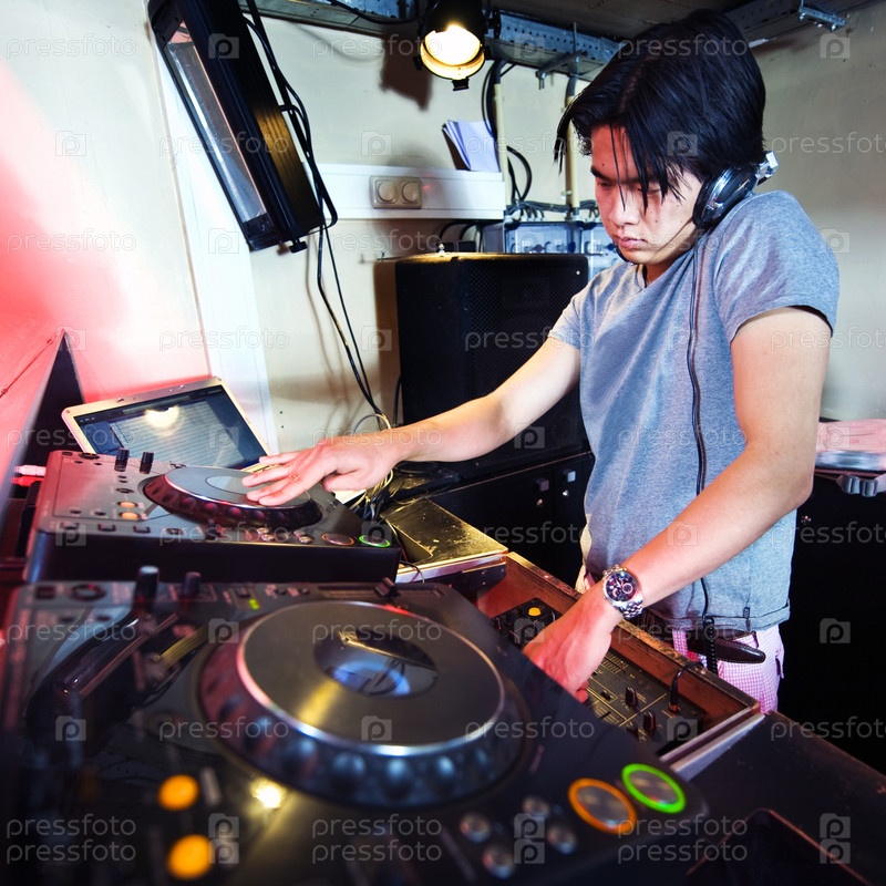Ди-джей делает миксы и скрэтчи, стоя в наушниках за диджейским пультом