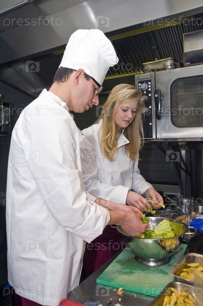 Шеф-повар и его помощник выбирают салат из дуршлага