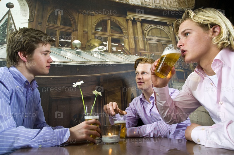 Трое молодых людей пьют пиво в баре