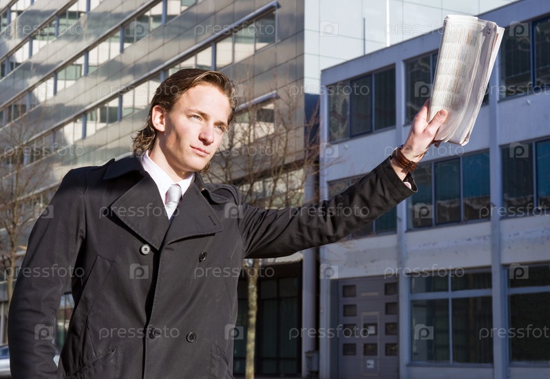Бизнесмен поднимает руку с газетой в попытке остановить такси. Таксист видит ег, но не останавливается