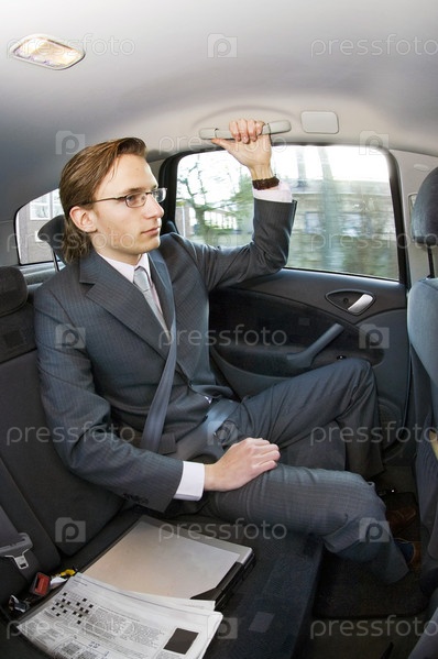 Бизнесмен едет на заднем сиденье такси
