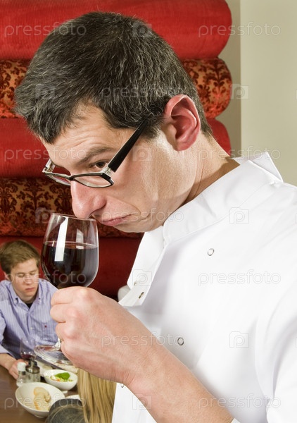 Винный официант смакует изысканное вино в ресторане с клиентами на заднем плане