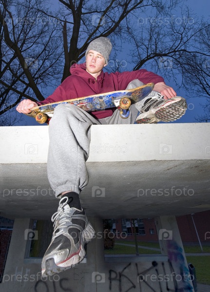 Молодой скейтбордист позирует на бетонном выступе