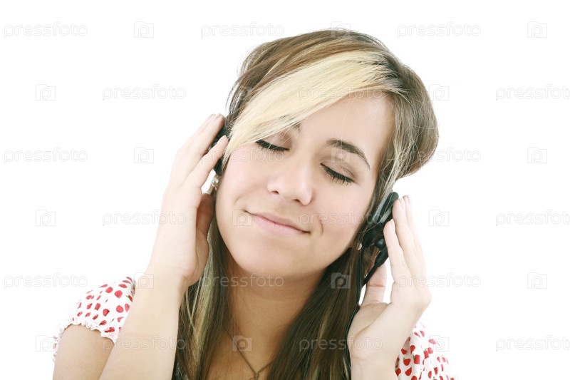 Женщина слушает музыку в наушниках, изолированная на белом фоне