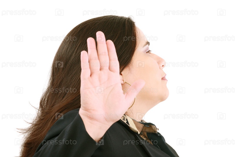 Серьезная бизнес-леди делает знак стоп на белом фоне