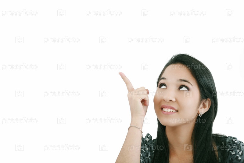 Молодая женщина показывает пальцем вверх