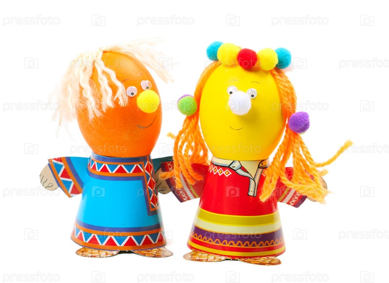 Смешные пасхальные яйца в форме мальчика и девочки в русской традиционной одежде, изолированные на белом фоне