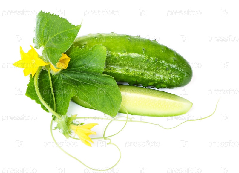 Свежий огурец с листьями и цветами, изолированный на белом фоне
