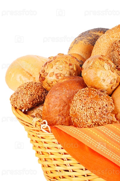 Разная выпечка в корзине на белом фоне