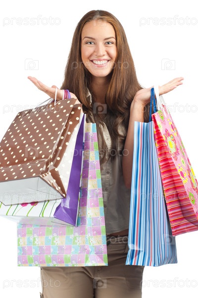 Молодая красивая женщина с красочными пакетами в руках