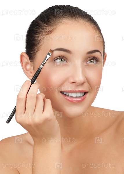Молодая красивая женщина делает макияж бровей с помощью кисти