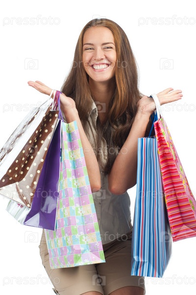 Молодая красивая женщина с красочными пакетами в руках