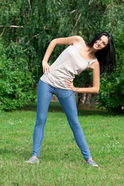 Молодая красивая женщина делает растяжку на свежем воздухе