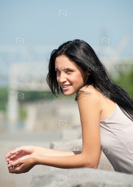 Симпатичная девушка с длинными темными волосами в повседневной одежде на свежем воздухе