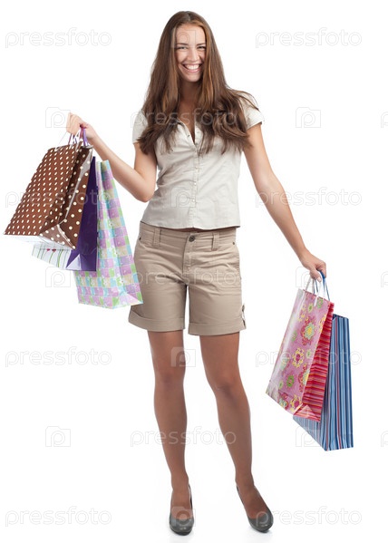 Молодая красивая женщина с красочными пакетами в руках