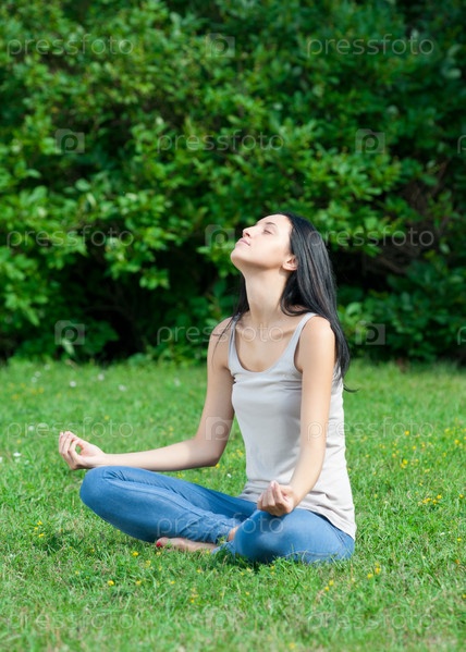 Молодая красивая женщина медитирует в парке
