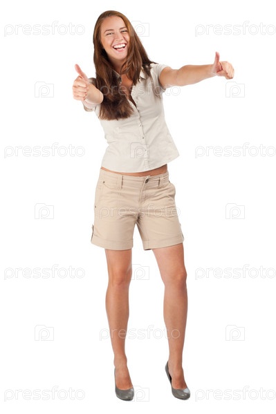 Жизнерадостная молодая женщина в повседневной одежде празднует победу на белом фоне