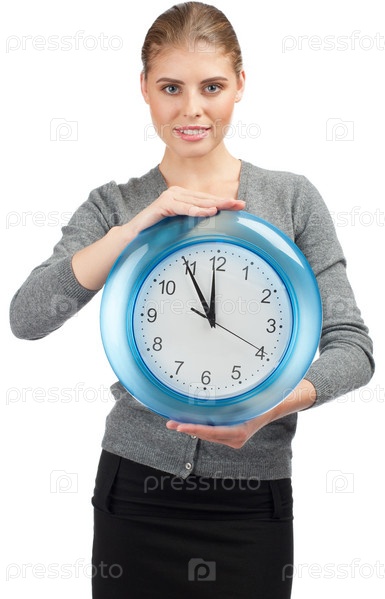 Привлекательная молодая бизнес-леди с большими часами на белом фоне