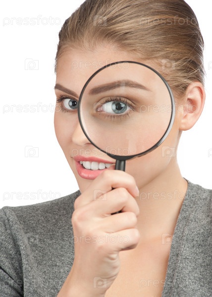Привлекательная девушка смотрит сквозь увеличительное стекло на белом фоне