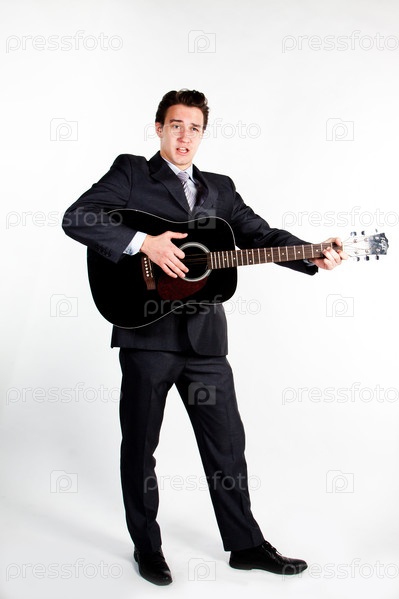 Молодой симпатичный мужчина в темном деловом костюме поет и играет на гитаре