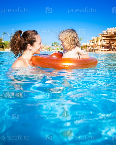 Счастливая семья играет в голубой воде плавательного бассейна на тропическом курорте на берегу моря Летние каникулы концепция