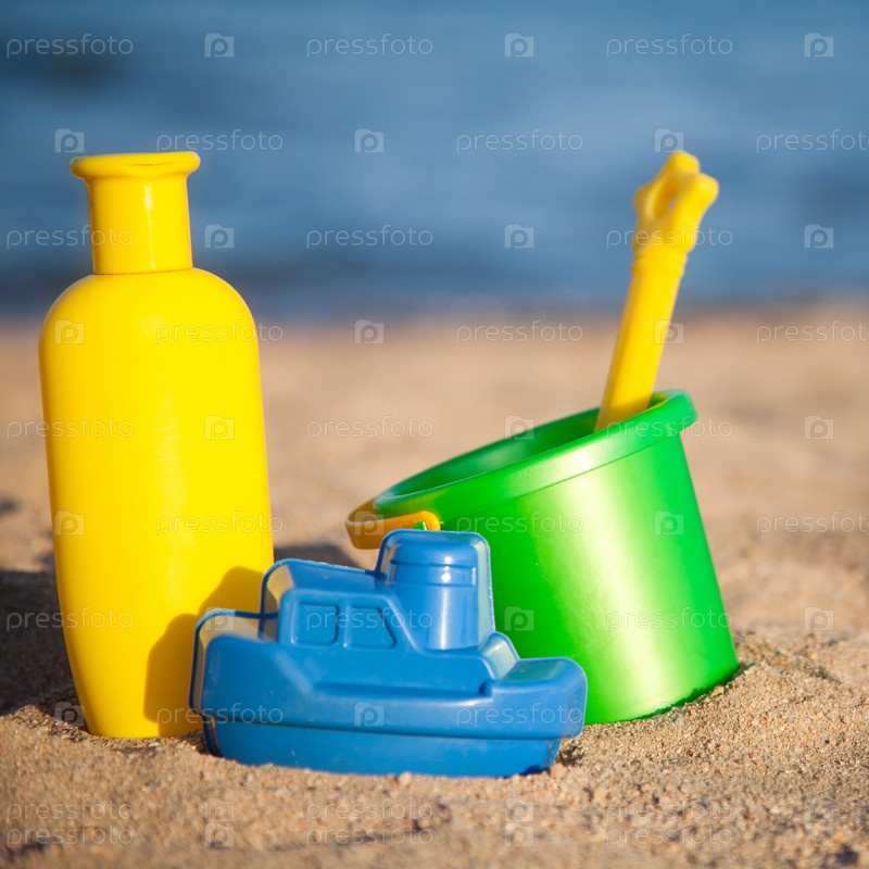 Детские игрушки и солнцезащитный лосьон на пляже. Летние каникулы