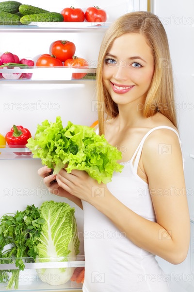 Девушка с зеленым салатом у холодильника