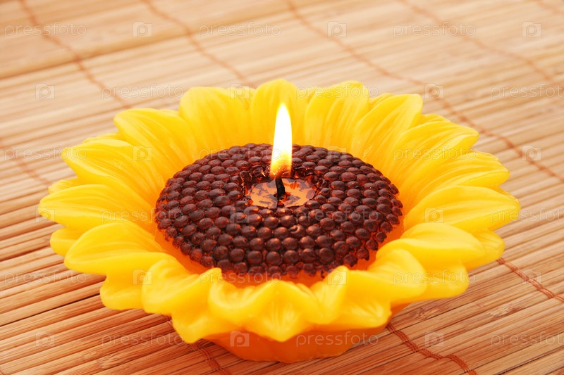 Свеча в форме подсолнечника на фоне бамбука