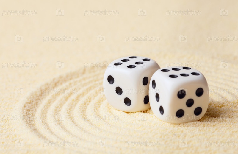 Круги на песке в японском саду камней с игровыми кубиками внутри - миниатюрная композиция