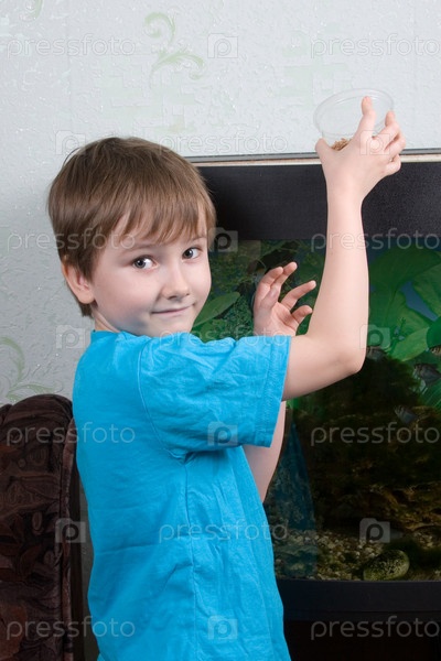 Мальчик кормит рыб в домашнем аквариуме