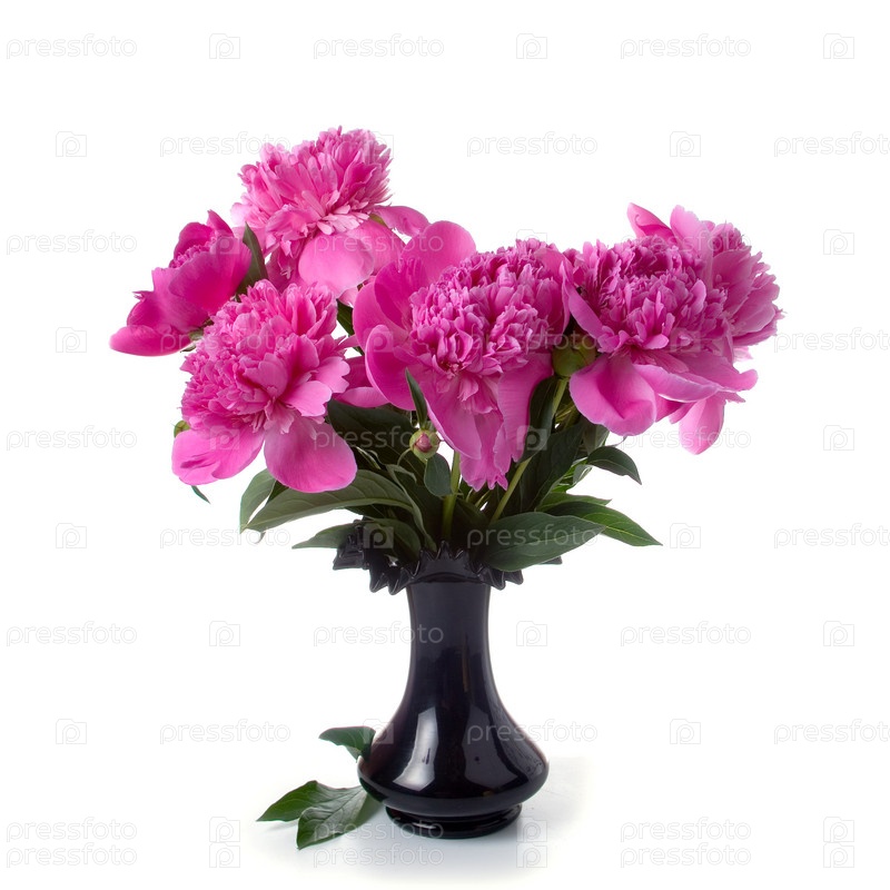 Розовые пионы в черной вазе, изолированные на белом фоне