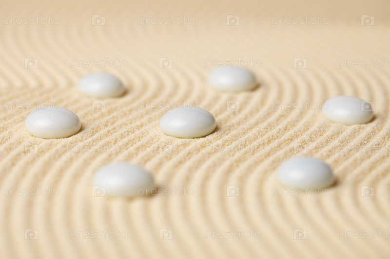 Композиция из семи керамических камней на песке в японском каменном саду
