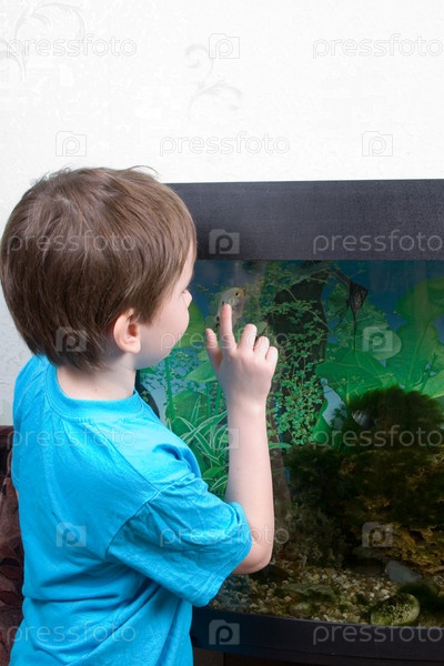 Мальчик смотрит на аквариумных рыбок у себя дома