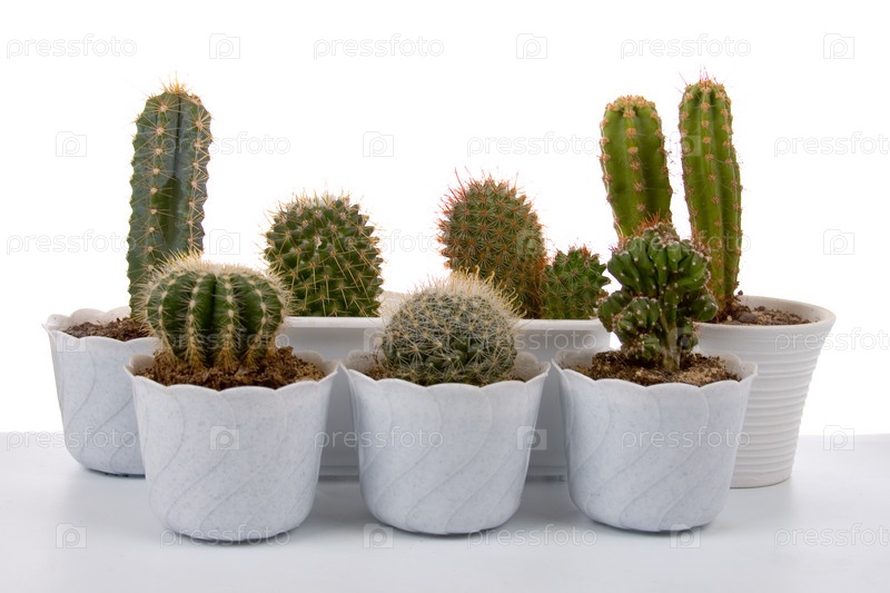 Кактусы в горшках на белом фоне