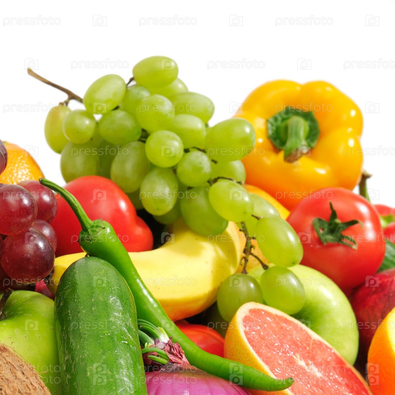 Свежие фрукты и овощи, изолированные на белом фоне