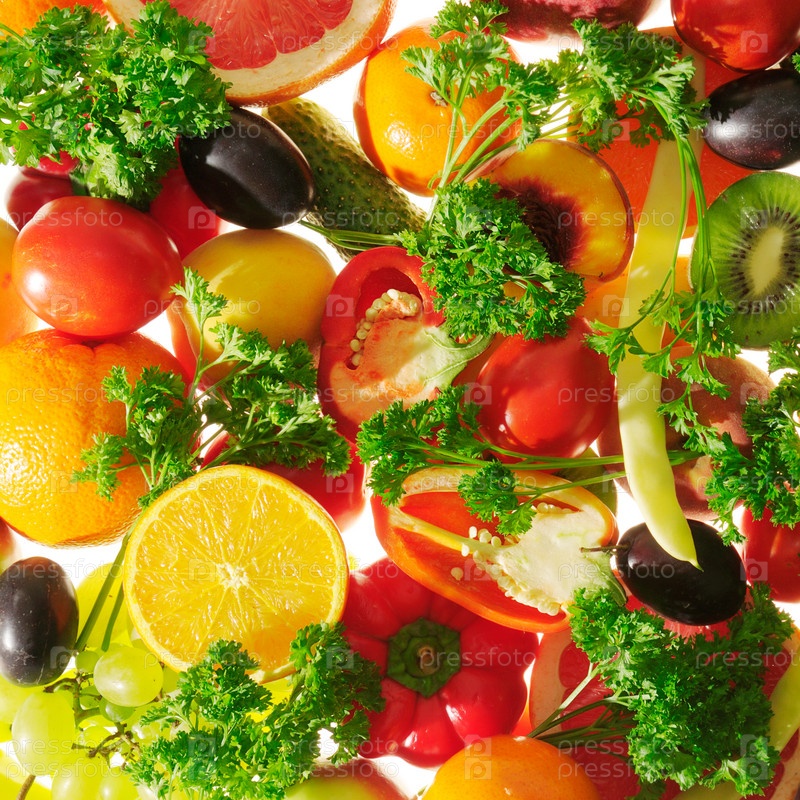 Свежие фрукты и овощи, изолированные на белом фоне