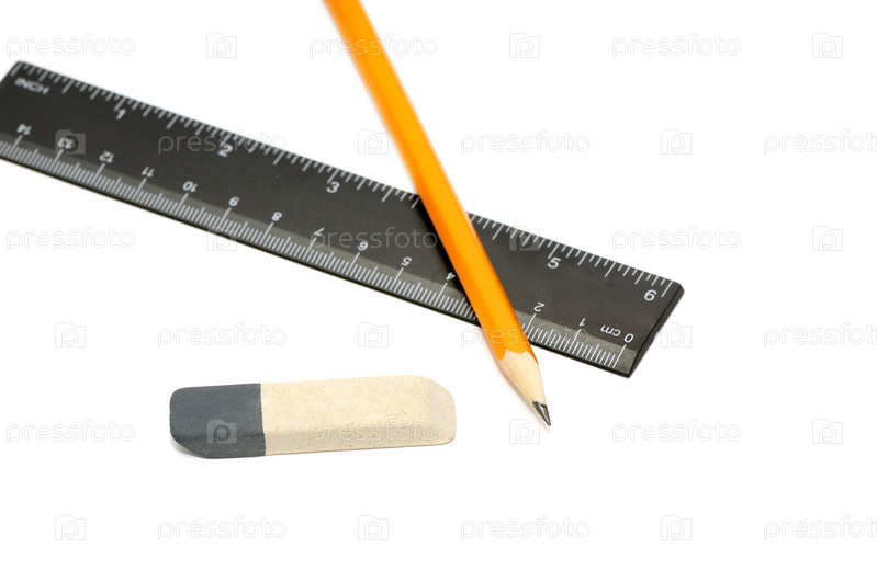 Карандаш, ластик и линейка на белом фоне