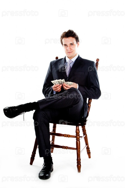 Портрет молодого симпатичного бизнесмена в темном строгом костюме с долларами