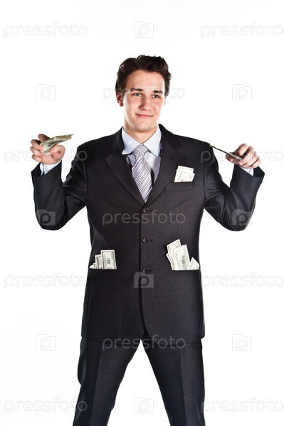 Портрет молодого симпатичного бизнесмена в темном строгом костюме с долларами
