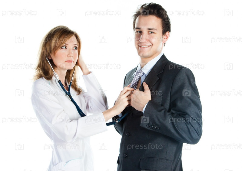 Молодой успешный и респектабельный бизнесмен в темном деловом костюме на приеме у молодой красивой женщины-врача в белом халате