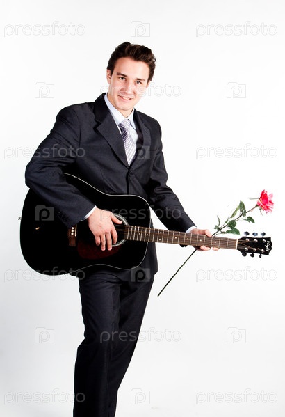 Молодой симпатичный мужчина в темном деловом костюме поет и играет на гитаре