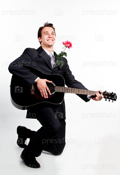 Молодой симпатичный мужчина в темном деловом костюме поет и играет на гитаре